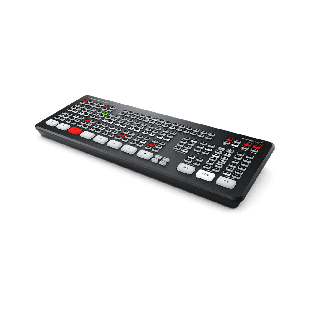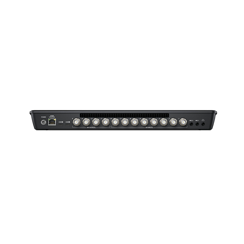 Il comprend huit entrées 3G-SDI, deux sorties USB-C pour webcam ou enregistrement vidéo, deux sorties 3G-SDI, un mixeur audio Fairlight avec EQ et dynamique, des DVE pour des effets d’image dans l’image, des transitions, un incrustateur chromatique sur fond vert, 20 images fixes pour les titres dans la bibliothèque de médias, et le logiciel ATEM Software Control gratuit.