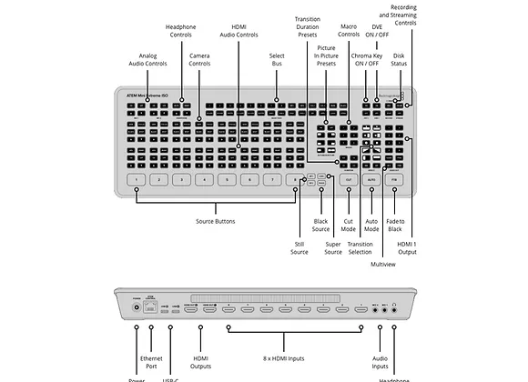 Il comprend quatre entrées HDMI standard, une sortie USB pour webcam, une sortie HDMI, un mixeur audio Fairlight avec EQ et dynamique, des DVE pour des effets d’image dans l’image, des transitions, un incrustateur chromatique sur fond vert, 20 images fixes pour les titres dans la bibliothèque de médias et le logiciel ATEM Software Control gratuit.