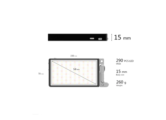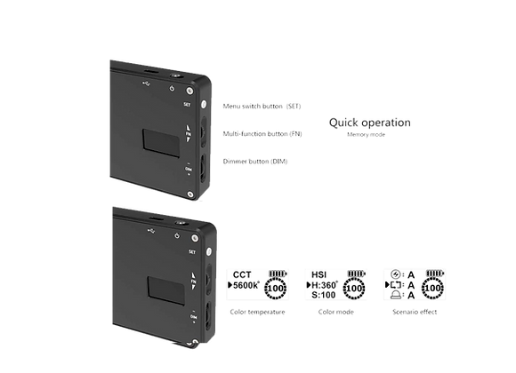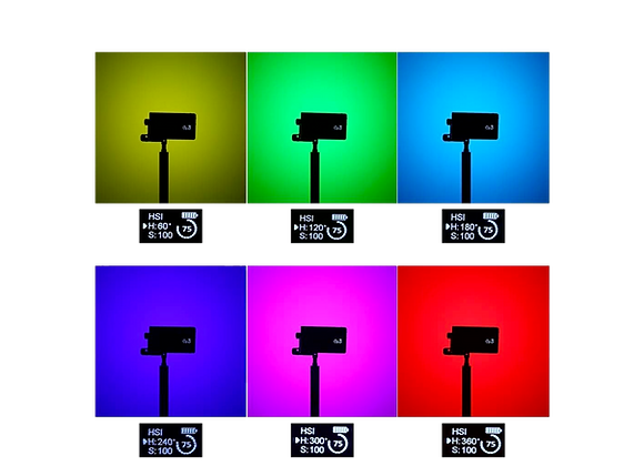 Il intègre trois modes différents pour régler la lumière selon les besoins : le mode CCT pour ajuster la température de couleur sur une plage de 2500 à 8500K, le mode HSI pour une utilisation en mode RGB et le mode Fx pour utiliser les effets intégrés (Police, Eclair, TV, etc.).