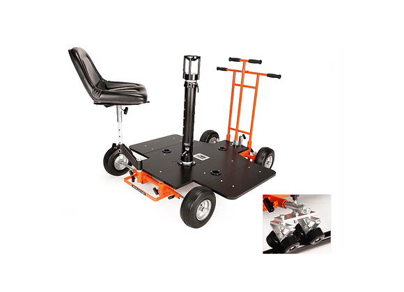 La Dolly Matthew Doorway peut s’utiliser sur un sol lisse grâce à ses roues pneumatiques, ou sur rails via ses boogies wheels. Le remplacement des roues pneumatiques se fait rapidement et sans difficulté. Une barre est dédiée à la poussée et une autre à la direction dans le cas d’une utilisation sur roues pneumatiques.