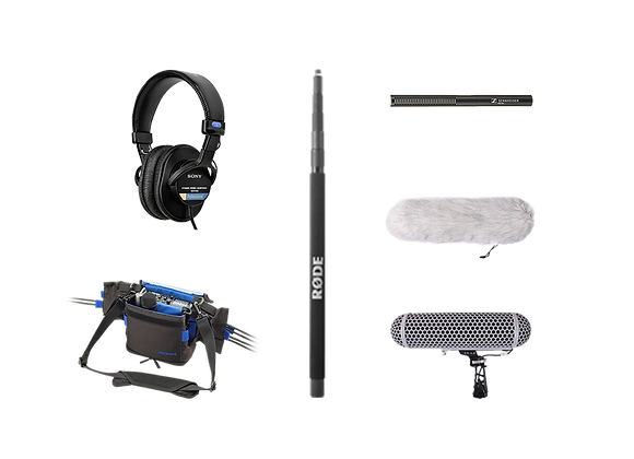 Le kit comprend un micro Sennheiser MKE 600, un enregistreur Zoom F8n avec sacoche à bandoulière, une perche Rode Boompole avec Blimp et deadcat ainsi qu'un casque son Sony MDR-7506.