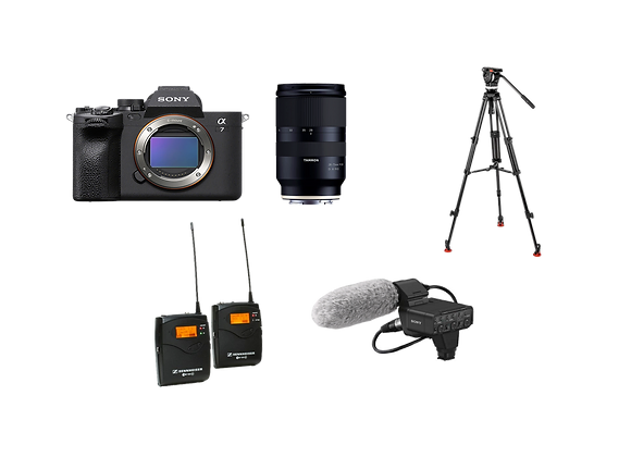 Kit interview complet incluant un boitier Sony A7, un zoom standard Tamron 28-75 F2.8 (ou autre objectif sur demande), un trépied vidéo Sachtler Ace ainsi qu'un micro HF Sennheiser G4.