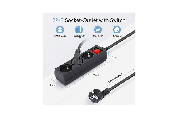 Ce modèle est équipé d’un interrupteur on/off avec témoin lumineux, le câble de la version 3 prises mesure 150cm et celui de la version 4 prises 290cm.